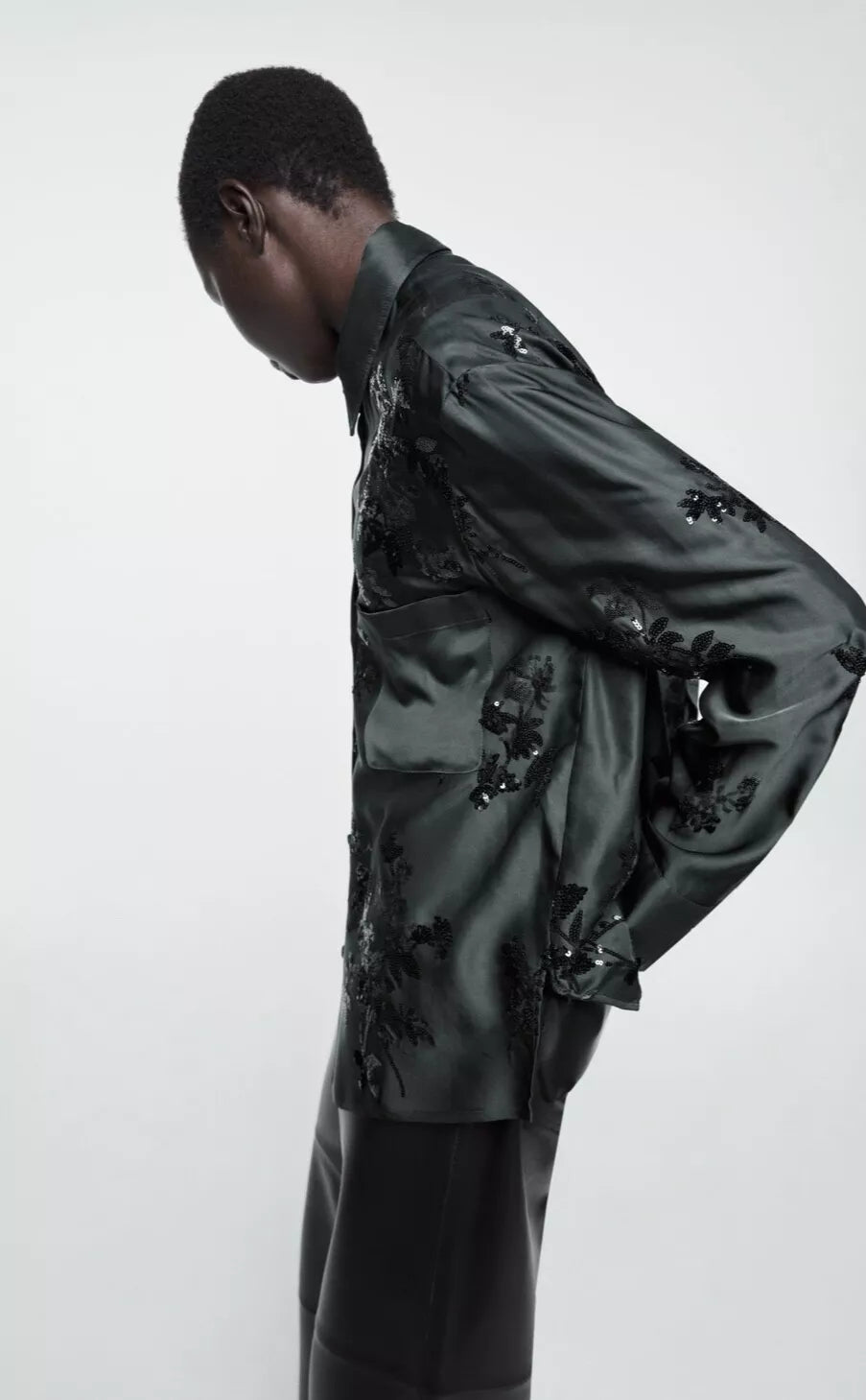 Curated archive piece from Zara, Fall/Winter 2022. Dive into dramatic glamour with this incredible two-piece set, featuring a matching shirt and wide-leg trousers adorned with black tonal sequin embroidery.